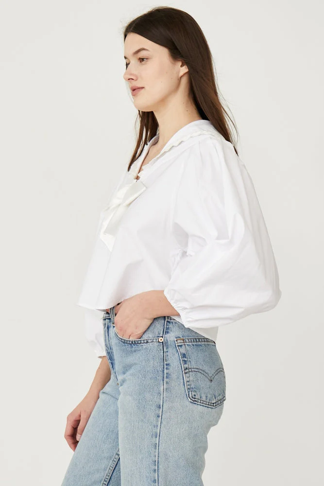 Hellooooo sailor! Alia is ready for seafaring, restaurantfaring, or whatever other faring you might have in mind this weekend. This dreamy sateen top sports a floaty, boxy fit with slightly cropped puff sleeves, pearly buttons, a bow at the front and a parade of hearts along the sailor-esque collar. Throw on over your favorite jeans and give a nautical nod to your next girls’ night, supermarket outing, or court date!