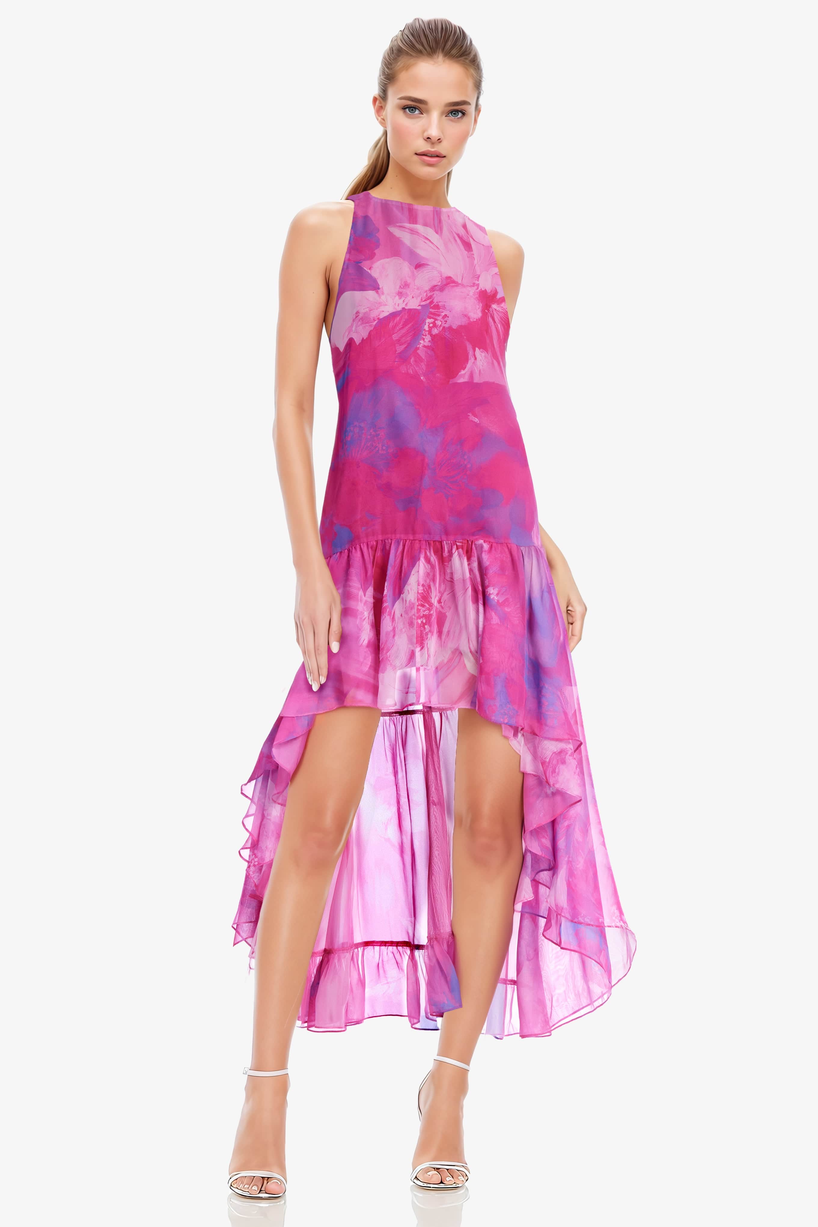 The Lila will always have your back with its lightweight, flowy, luxe chiffon fabric printed in our multi-colored fuchsia floral summer print. Its halter top and tiered ruffles give it an elevated look, perfect for a guest of wedding look, bridal shower, or engagement party! Pair it with a clutch & heels to dress it up, or with a jean jacket draped over your shoulders & a crossbody to dress it down, allowing you to wear it to a multitude of occasions. Eat freely, enjoy the breeze, and live it up at your event, in this on-trend summer must-have look!